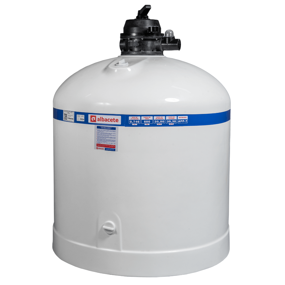 Filtro Série A e Série AE (Fibra de vidro) Os filtros para piscina de fibra de vidro ALBACETE são os melhores equipamentos existentes no mercado brasileiro atual. Os filtros série A e série AE são equipamentos para filtragem de alta vazão fabricados em resina de poliéster reforçada com fibra de vidro e acabamento em gel-coat isoftálico branco. Os filtros série AE são reforçados com uma camada extra de laminação com manta. A fim de assegurar a longevidade de nossos filtros, todo material utilizado em sua fabricação é anticorrosivo. Os filtros de fibra de piscina ALBACETE série A e série AE seguem de linha com válvula seletora de 6 (seis) operações: FILTRAR, DRENAR, FECHAR, LAVAR RECIRCULAR E PRÉ-FILTRAR, com manômetro e visor de retrolavagem. Única válvula seletora no Brasil fabricada com rosca e eixo de metal, conferindo grande durabilidade ao seu equipamento.